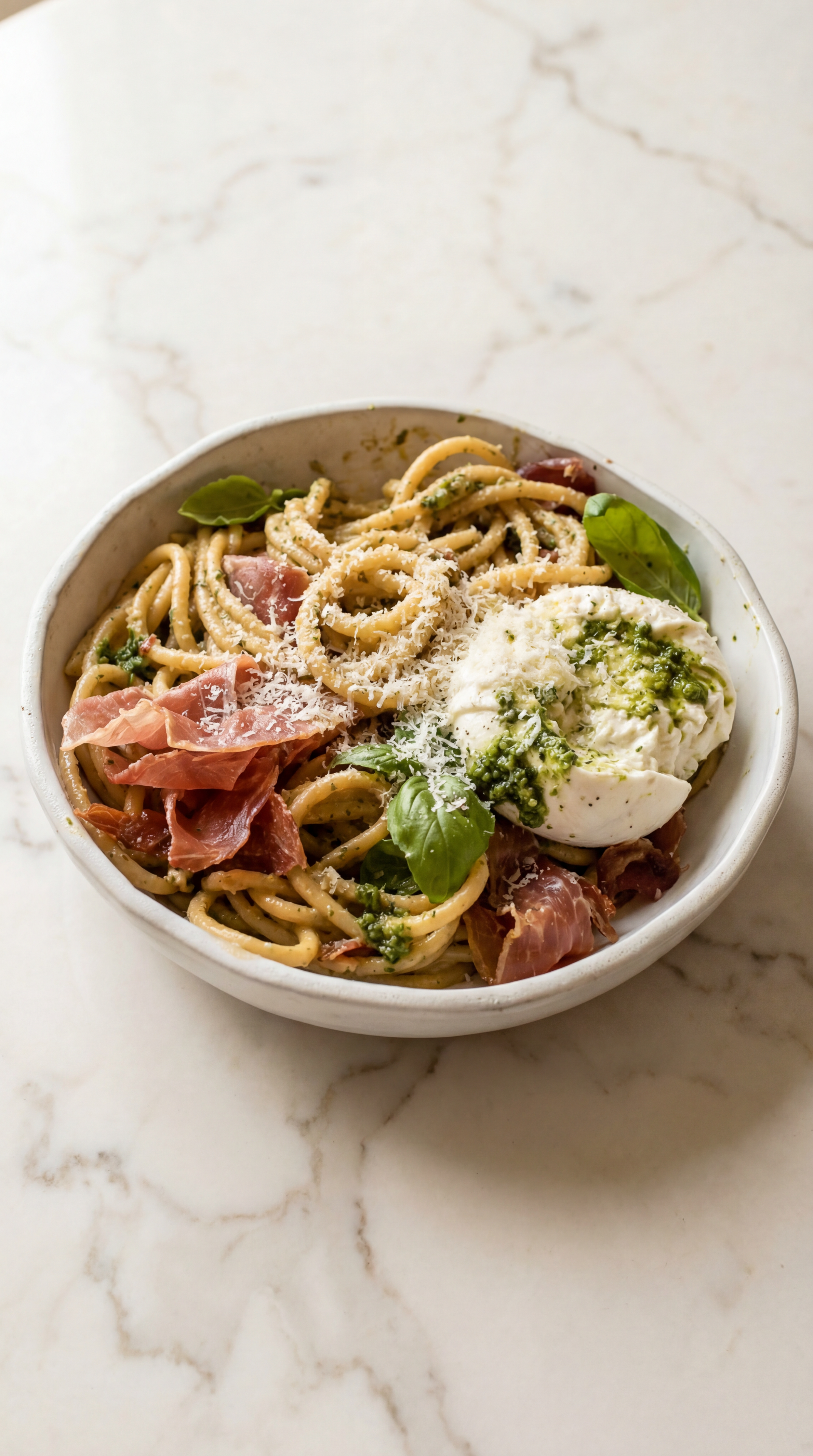 My Basil and Garlic Pasta with Prosciutto and Burrata feels like elevated comfort at its finest. Warm pasta is coated in fragrant basil and garlic, layered with savory prosciutto, and finished with creamy burrata that melts beautifully into every bite. It’s rich, cozy, and deeply satisfying, the kind of dinner that feels special but still completely comforting on a quiet night at home.