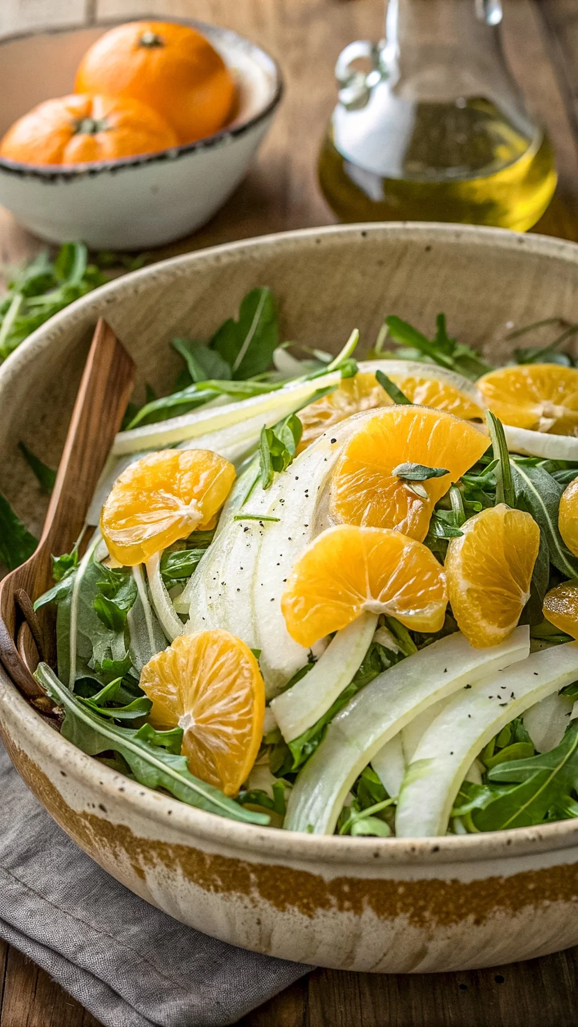This Arugula and Fennel Salad with Clementinesis the kind of salad that wakes up your plate. It’s fresh, peppery, and sweet — combining the delicate crunch of thinly shaved fennel with juicy, brightclementine slices, all tossed in a fragrantorange oil vinaigrette that’s light but flavorful.