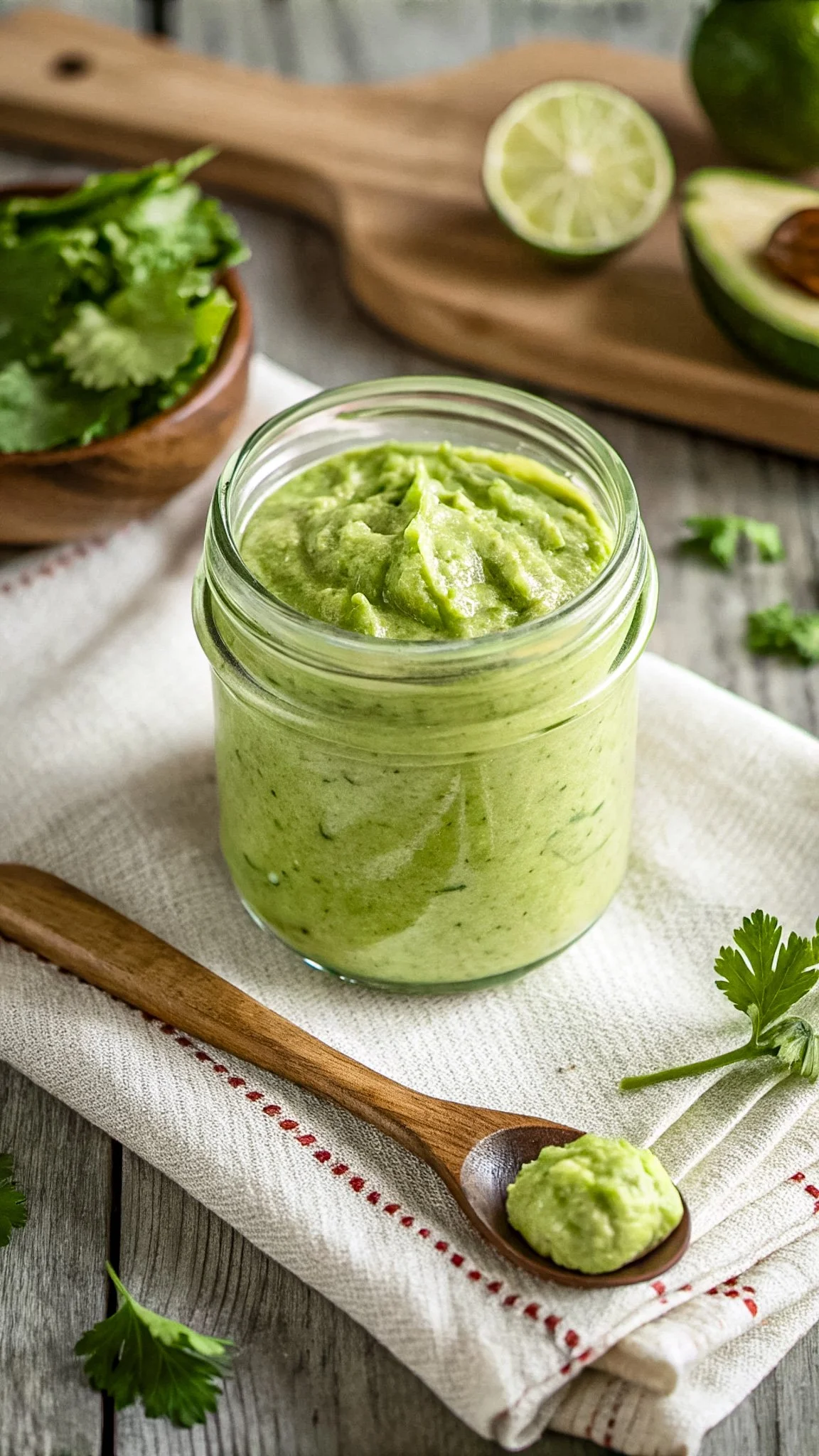 This recipe blends creamy avocado with fresh cilantro, garlic, lime juice, and a touch of jalapeño for optional heat — no dairy required.