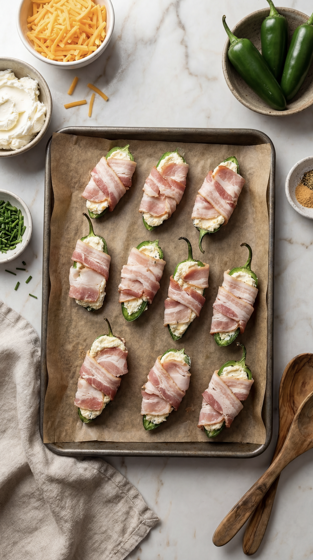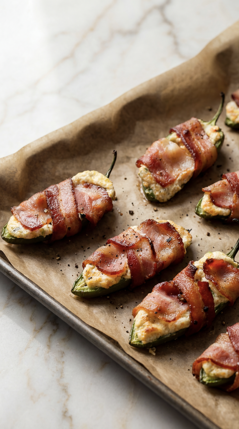 Wrap each stuffed jalapeño with a slice of bacon, slightly overlapping the edges.
