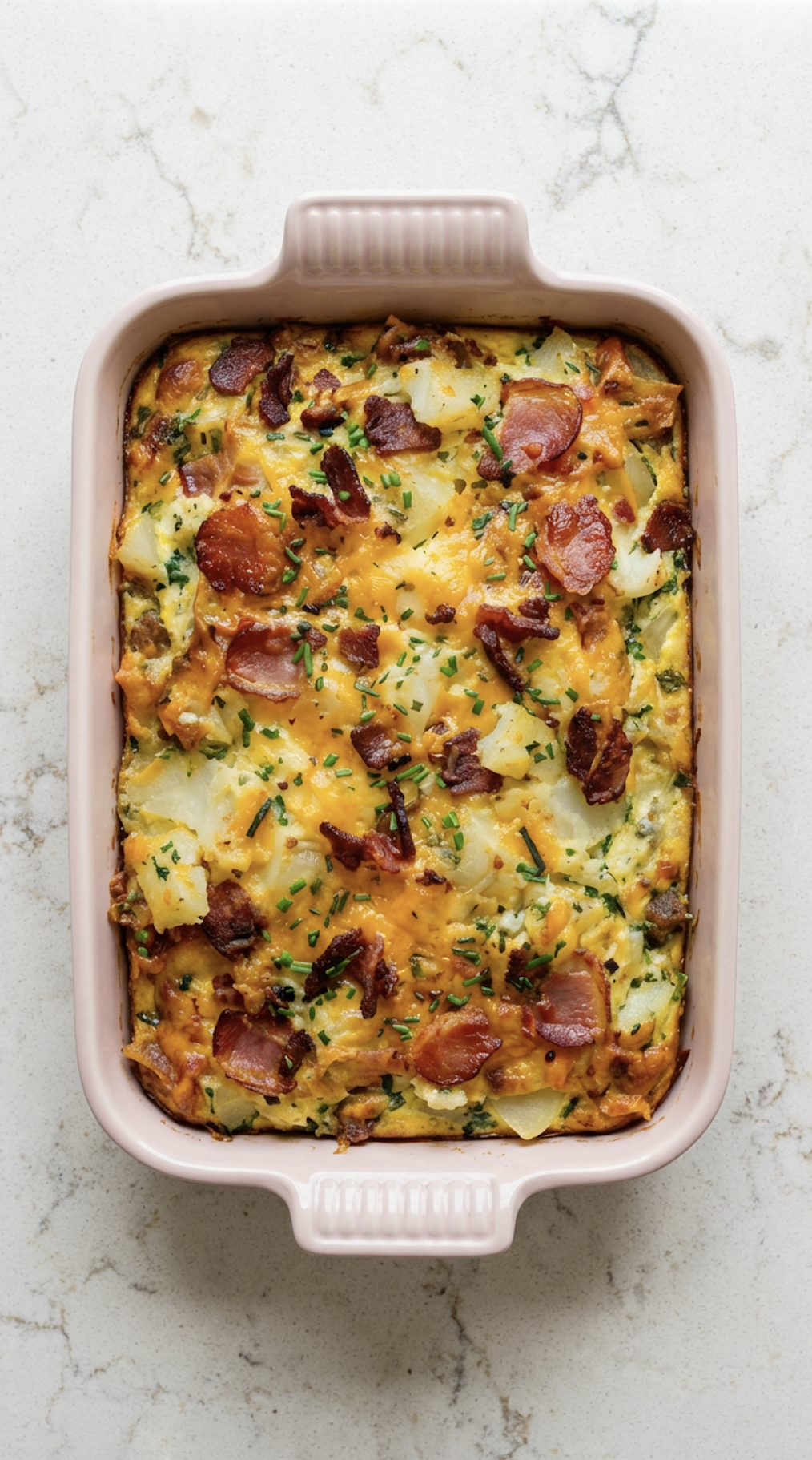 Breakfast Potato Casserole with Eggs, Bacon & Cheese