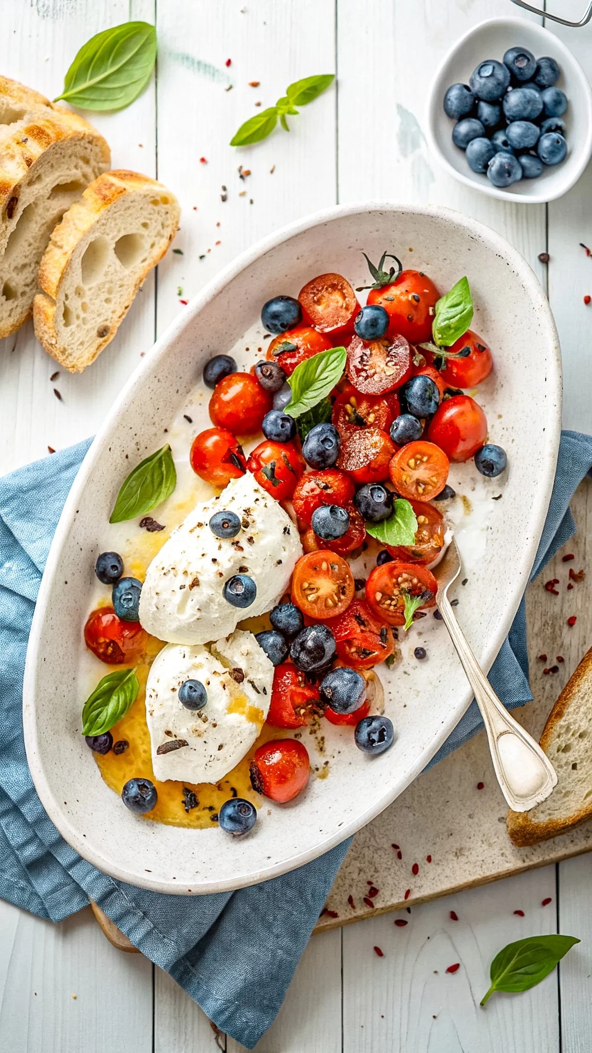 What I love about this dish is that it looks like you spent hours preparing it — but really, it’s just a handful of peak-season ingredients assembled thoughtfully. The juicy burst of blueberries and tomatoes, the richness of creamy burrata, the brightness of basil, and the earthiness of good olive oil — it’s everything I love about summer on one plate.