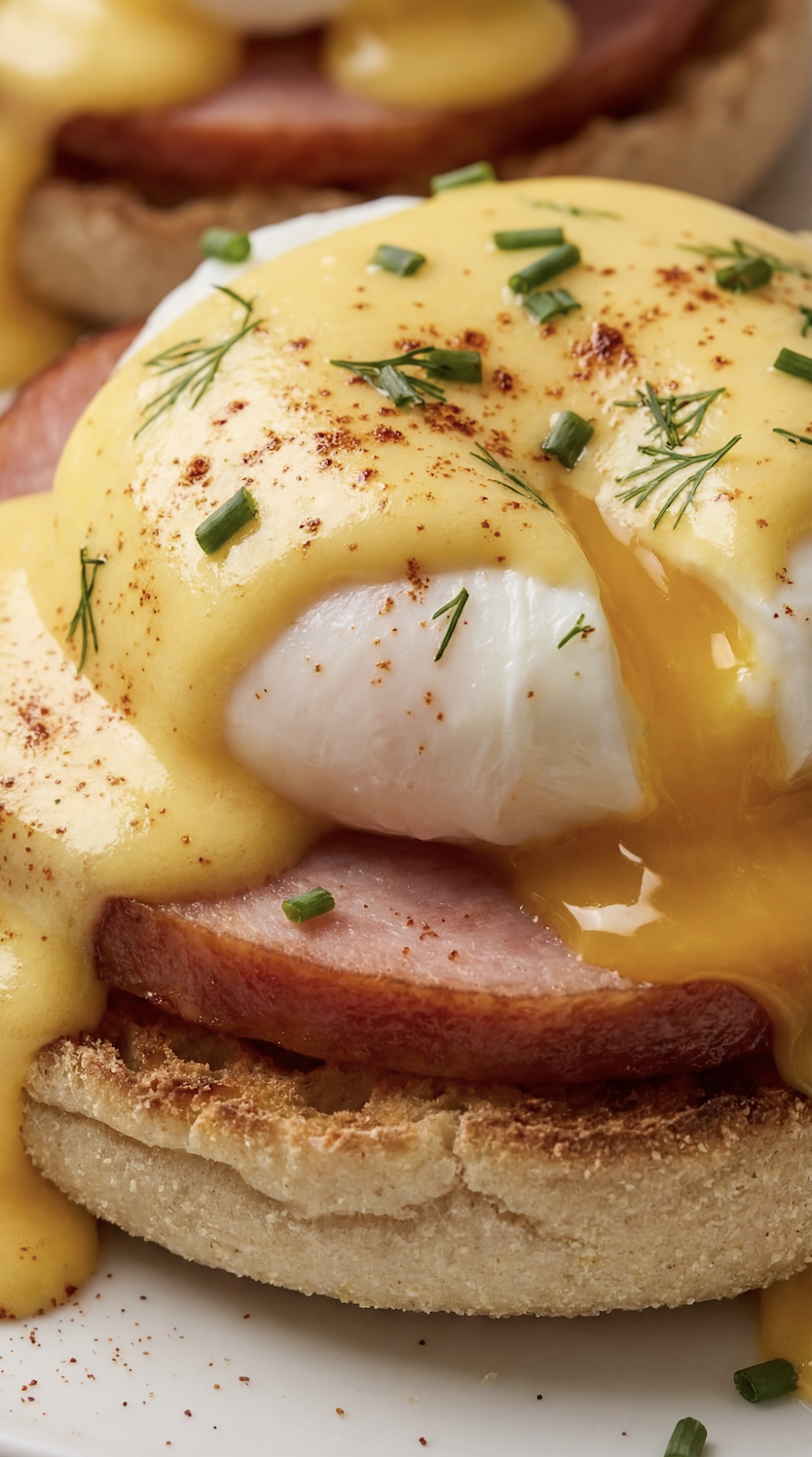 Golden toasted English muffins, warm savory ham, perfectly poached eggs with that soft, jammy center, all finished with silky, buttery hollandaise sauce that drips down the sides in the most satisfying way… it’s the kind of meal that turns a regular morning into a full-on brunch moment.