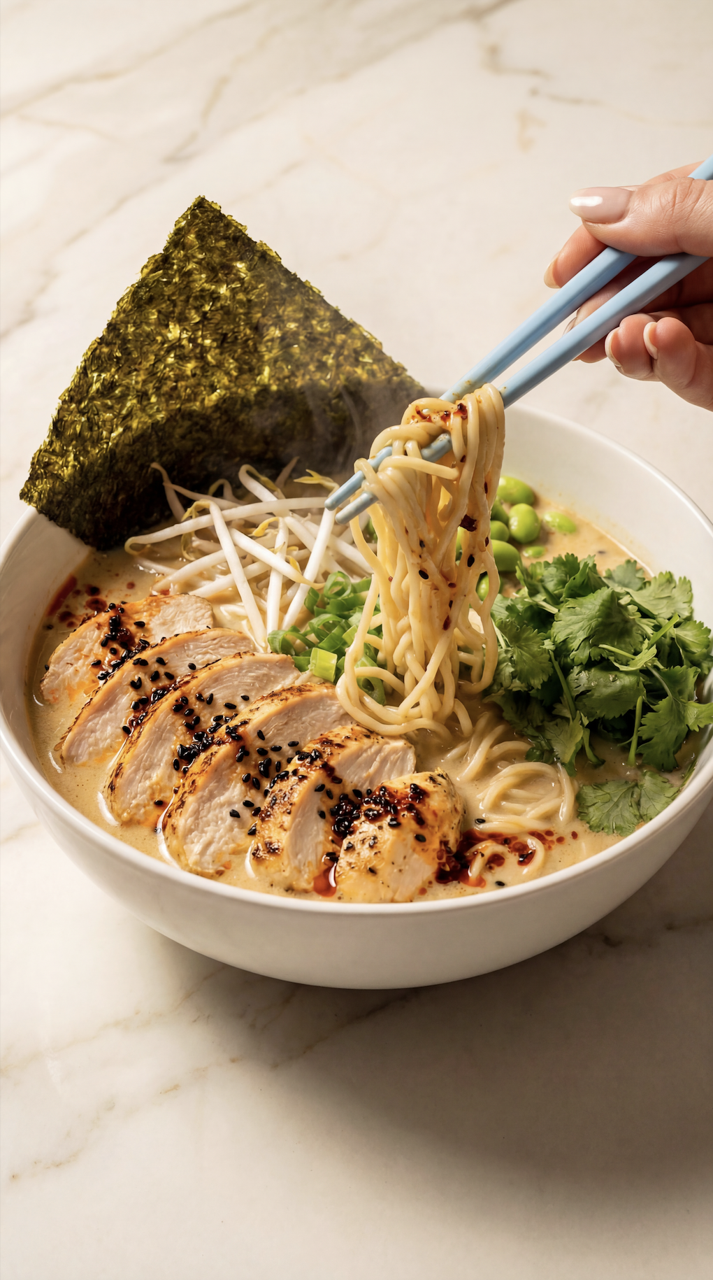 We’re talking: silky creamy broth, tender sliced chicken, chewy noodles, crunchy bean sprouts, buttery edamame, fresh green onions, savory seaweed, nutty black sesame seeds, and a drizzle of chili oil that ties everything together.