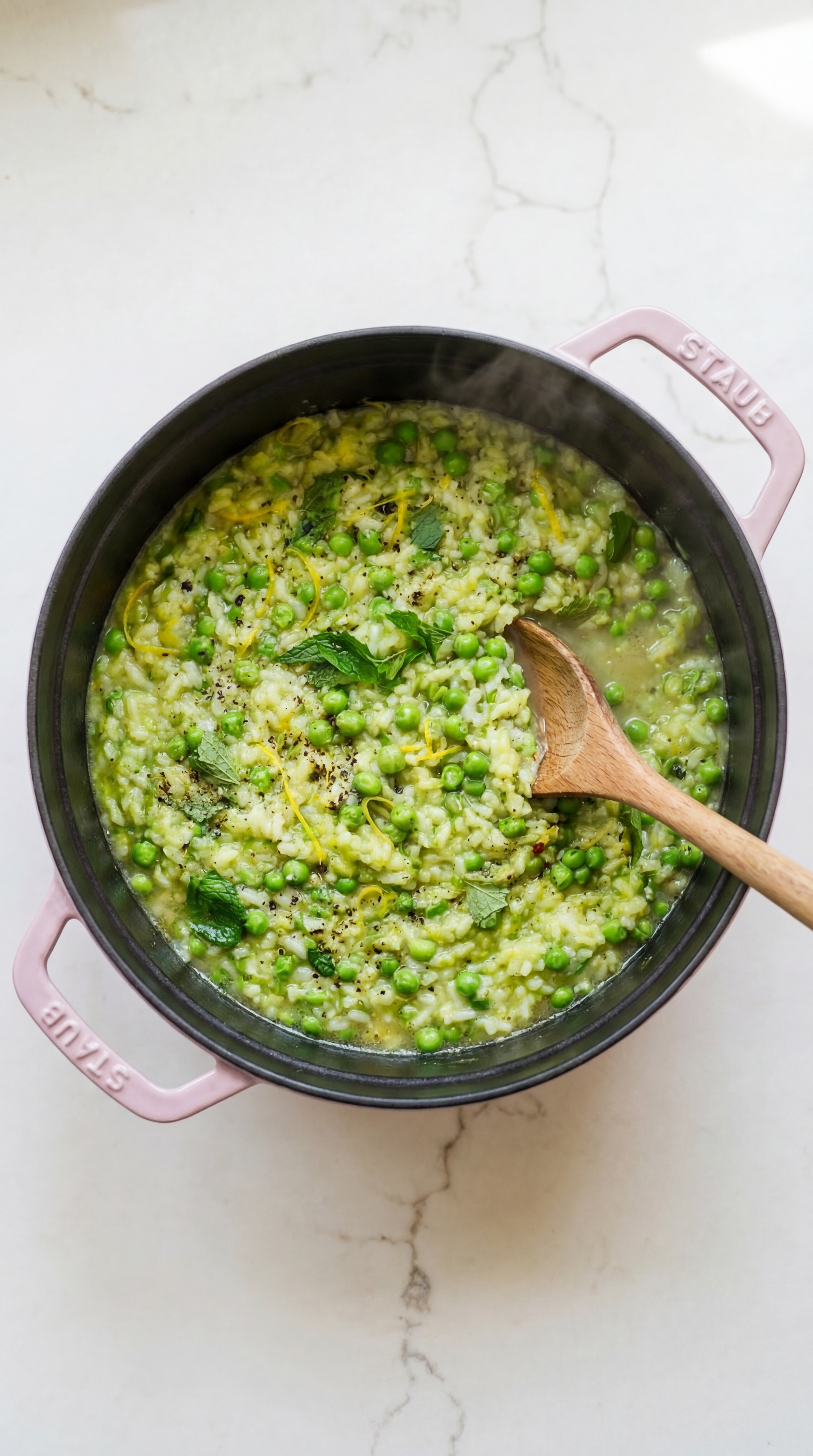 It’s creamy without being heavy, fresh without being boring, and cozy in that slow-simmered, stir-the-pot kind of way. The sweetness of the peas, the brightness from fresh lemon zest, and the pop of mint at the end make it feel special but not complicated or fussy.