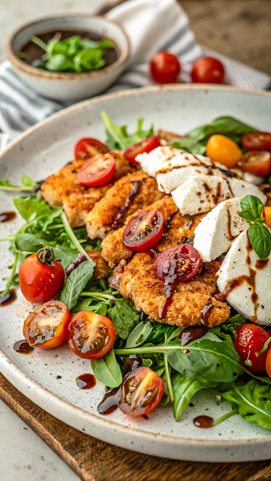 This is not your average salad. Imagine juicy, golden-crusted chicken sliced over fresh greens, ripe tomatoes, creamy mozzarella, and basil — all drizzled with a sweet and tangy balsamic glaze that you’ll want to lick off the plate.