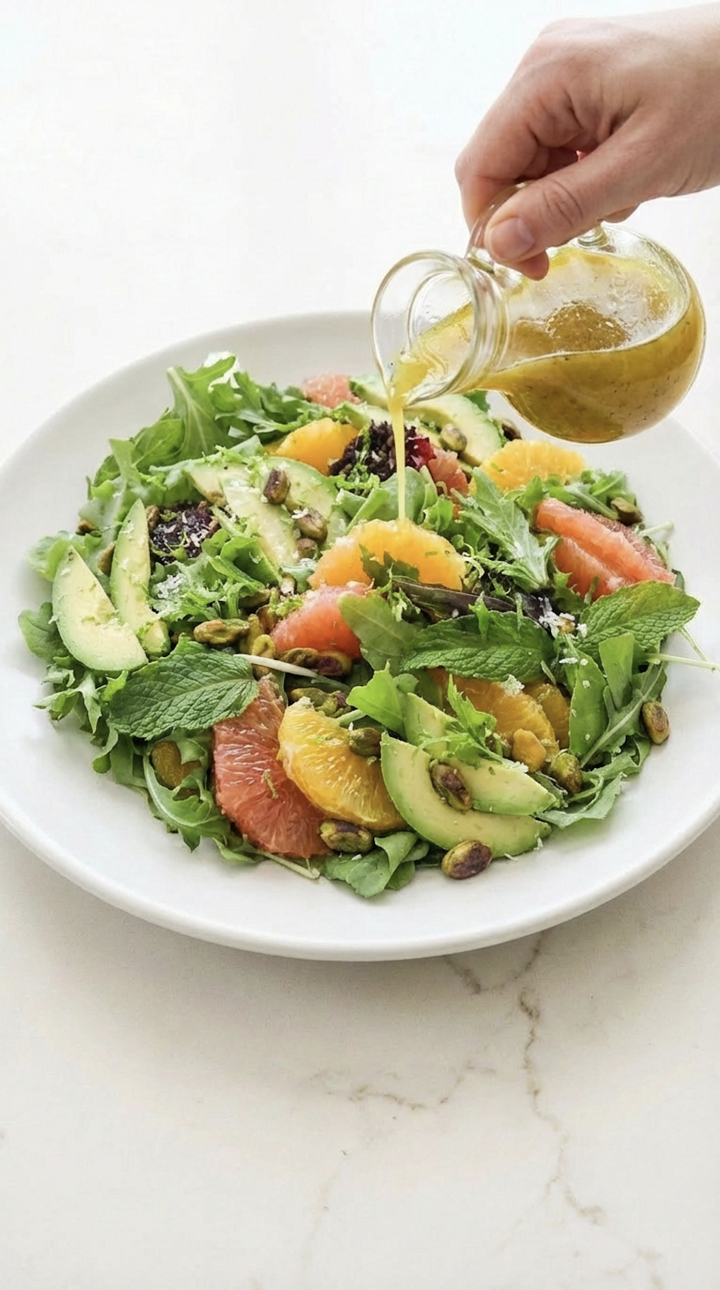 Add your greens to a large bowl or platter. Layer on the citrus, avocado, pistachios, and herbs. Drizzle with dressing just before serving.