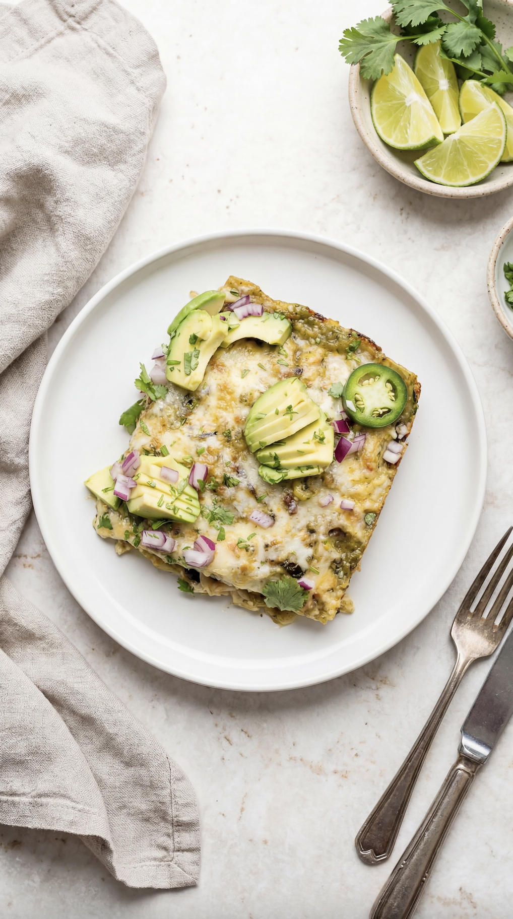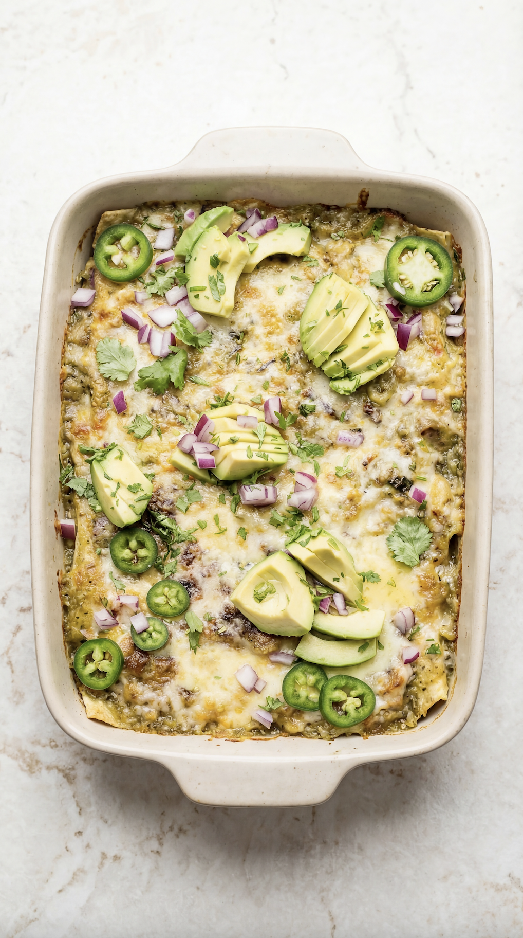 The layers bake together into this bubbly, cheesy, slightly crispy-edged casserole that’s impossible to resist. And once it comes out of the oven, the fun part begins - piling it high with fresh toppings like avocado, cilantro, red onion, and jalapeños.