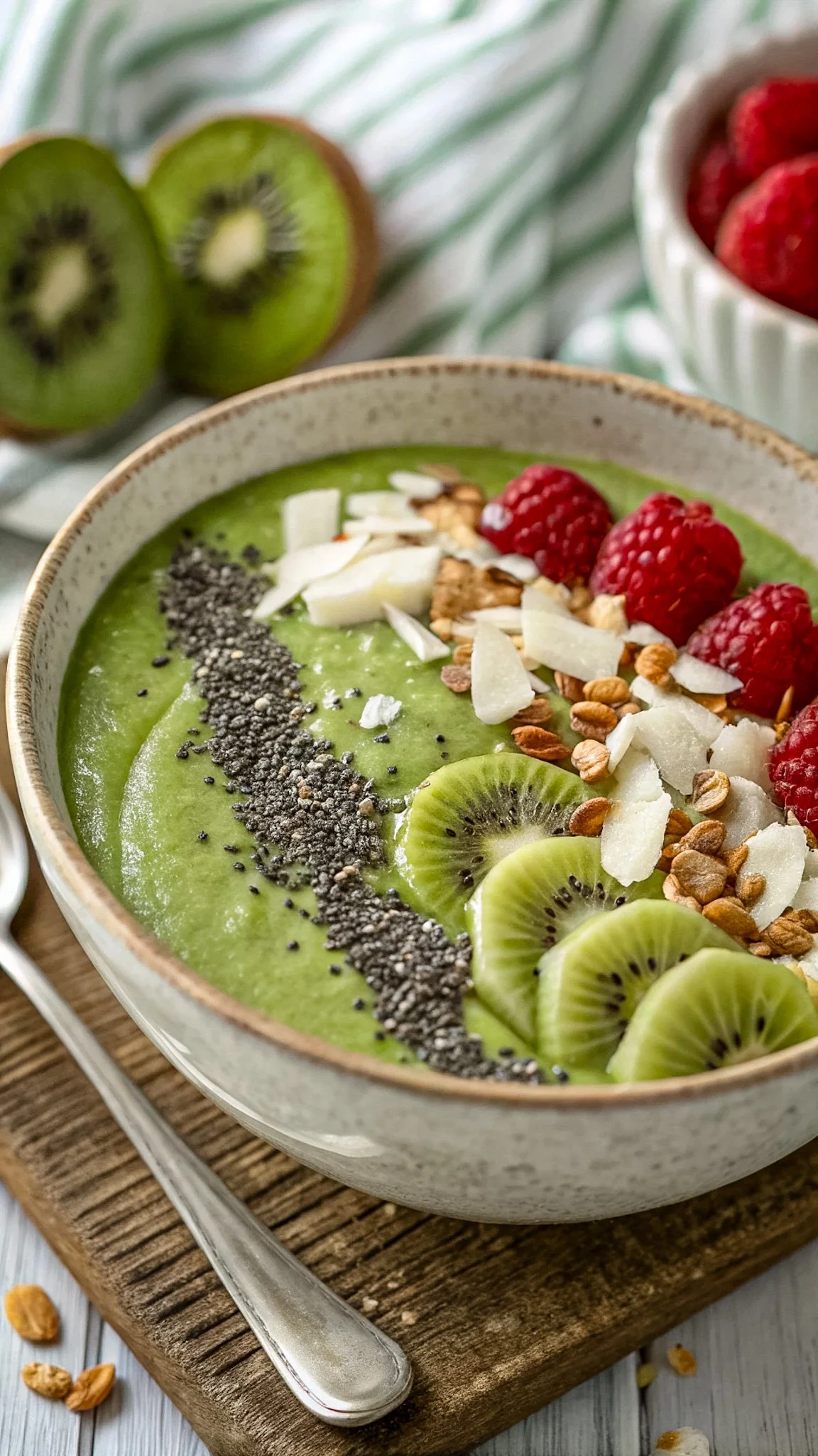 This smoothie bowl brings kiwi to center stage. Topped with sliced kiwi, raspberries, slivered almonds, and chia seeds, this bowl is a feast for the eyes and body.