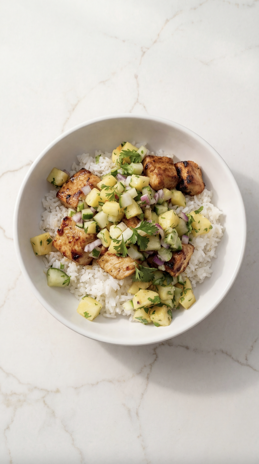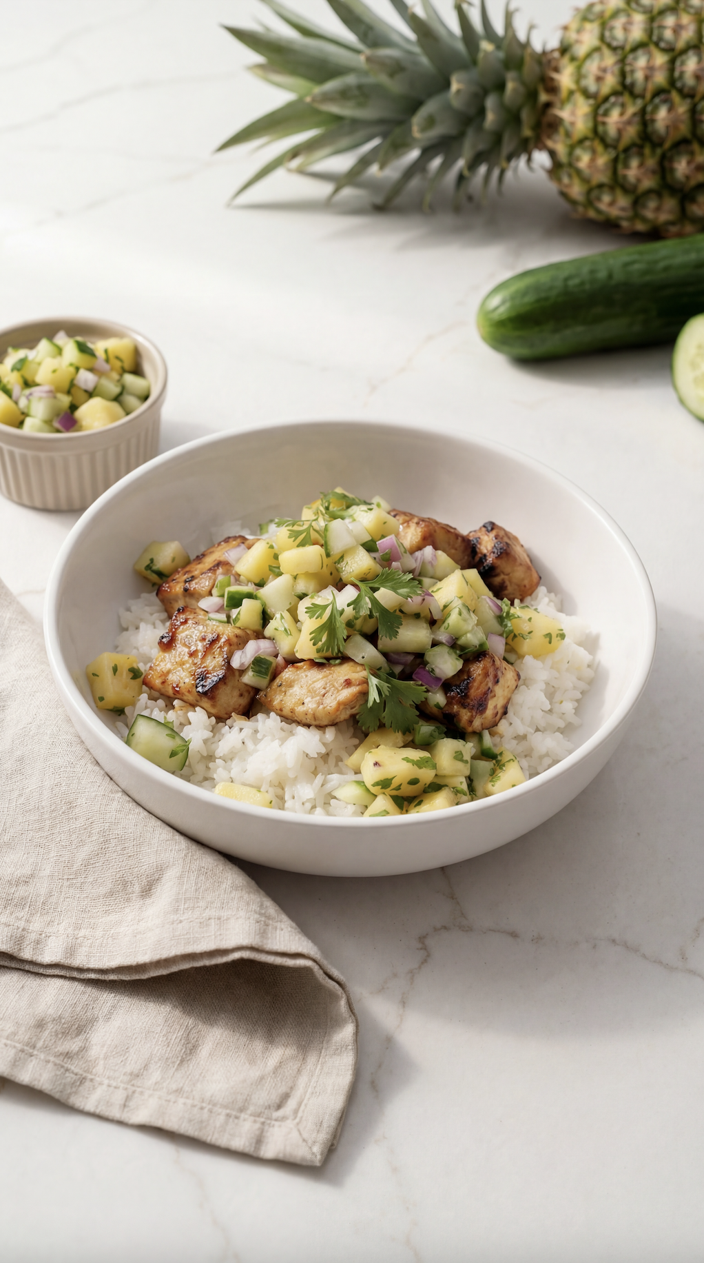 Some meals just feel like sunshine in a bowl, and this Grilled Chicken with Pineapple, Cucumber & Avocado Salsa served over rice is exactly that.