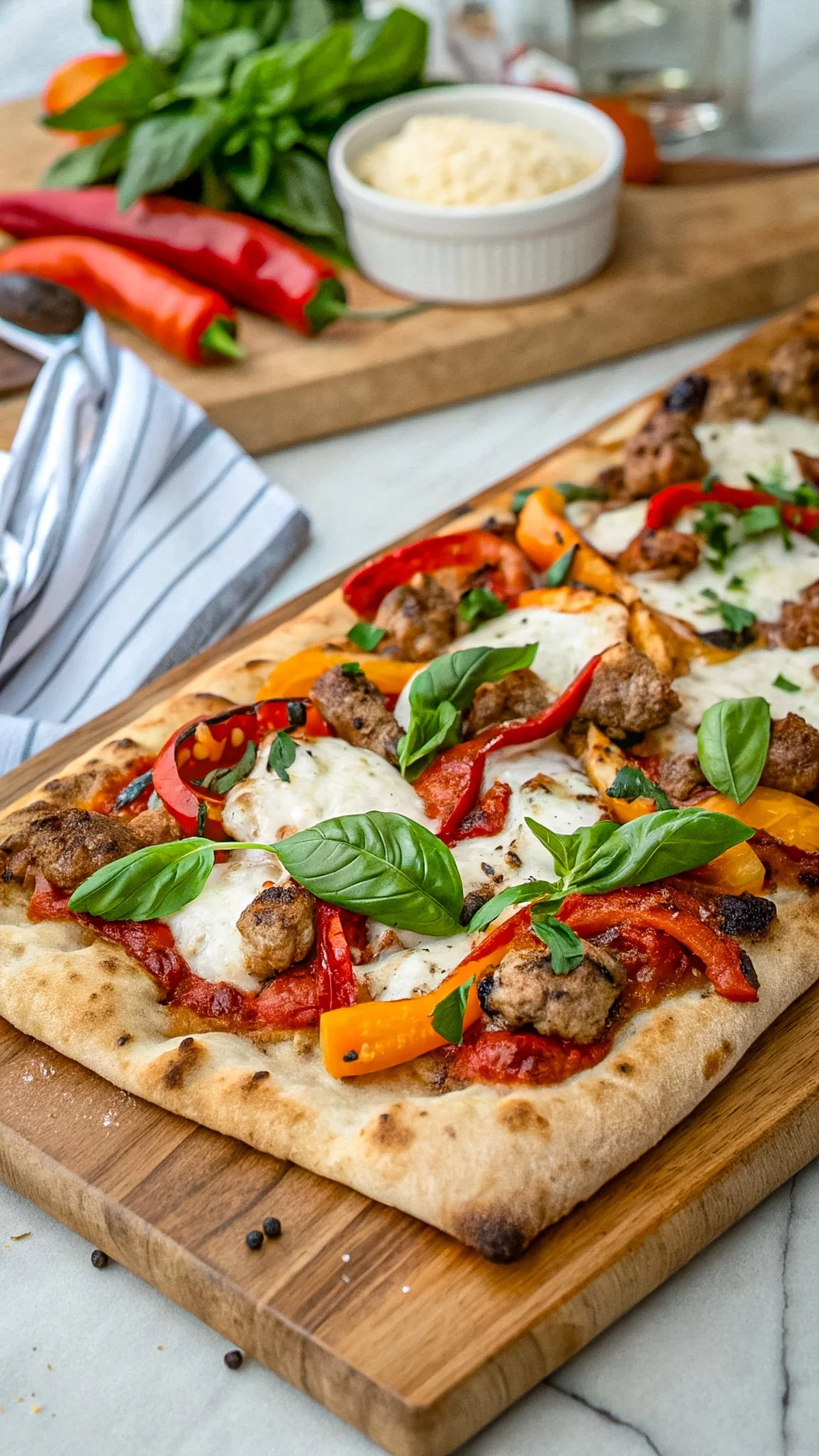 This Italian Sausage Flatbread is a delicious mashup of pizza night and rustic antipasto flavors — smoky roasted peppers, juicy Italian sausage, melty mozzarella, and fresh basil all layered over a crisp, golden flatbread. It’s simple, satisfying, and customizable with your favorite toppings or cheese blends.