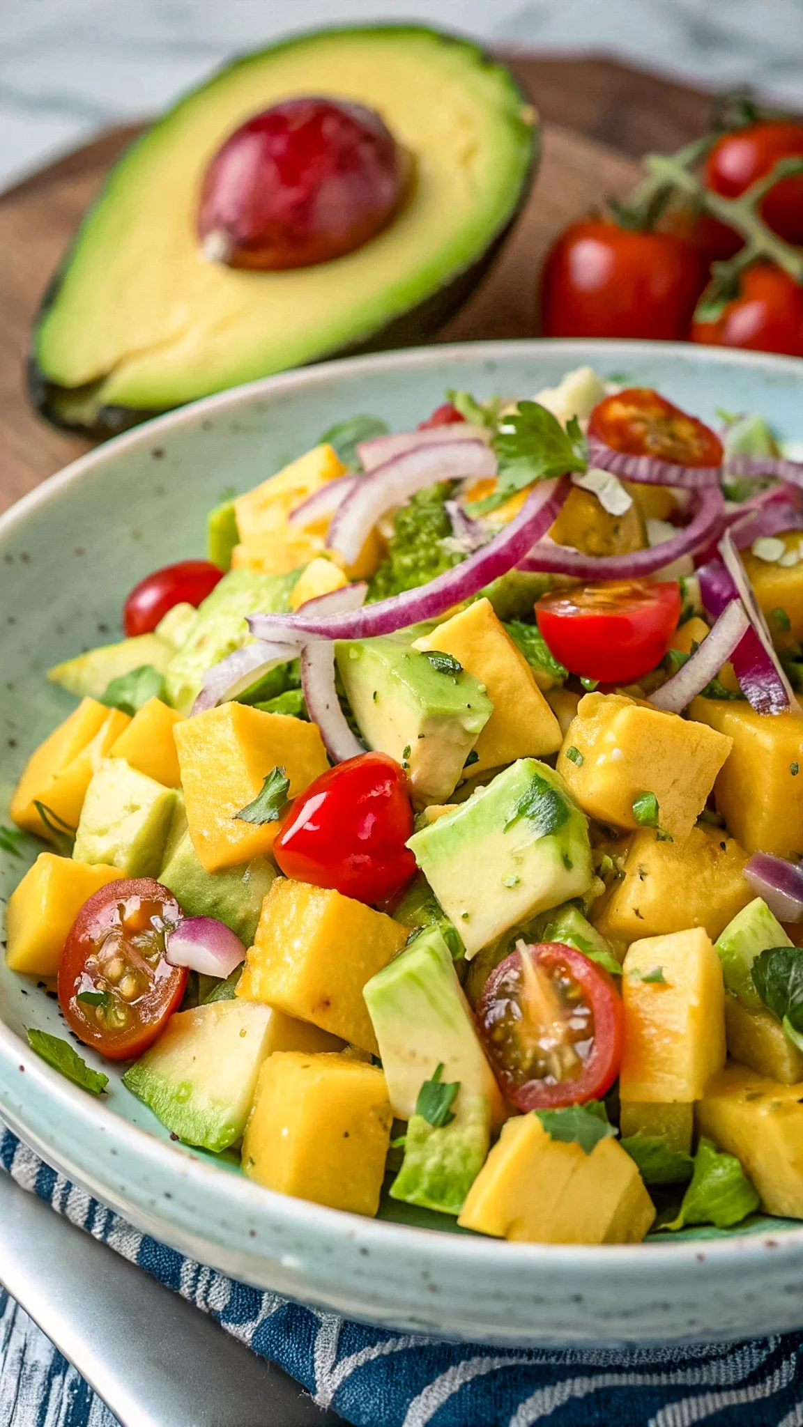 Make ahead tip: Prep mango, tomatoes, and onion ahead. Add avocado and dressing just before serving.