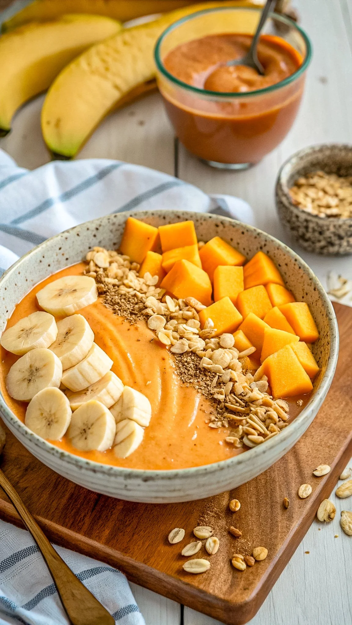 If you're looking for a smoothie bowl that tastes like a tropical vacation, this Mango Papaya Smoothie Bowl is it. It's creamy, refreshing, and naturally sweet with no added sugar — made with frozen mango, ripe papaya, and banana for the perfect texture. Topped with sliced bananas, more mango chunks, and toasted granola, this bowl brings together flavor and crunch in every bite.
