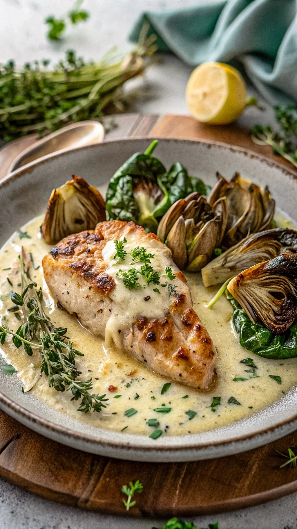 There’s something irresistible about the simplicity of golden, pan-seared chicken in a buttery garlic sauce — but this version levels up the classic with fresh thyme, lemon, roasted artichokes, and a touch of melted cheese for richness. Served over a bed of lightly seared spinach, it’s a perfect balance of bright, earthy, creamy, and herby — all made in just one pan.