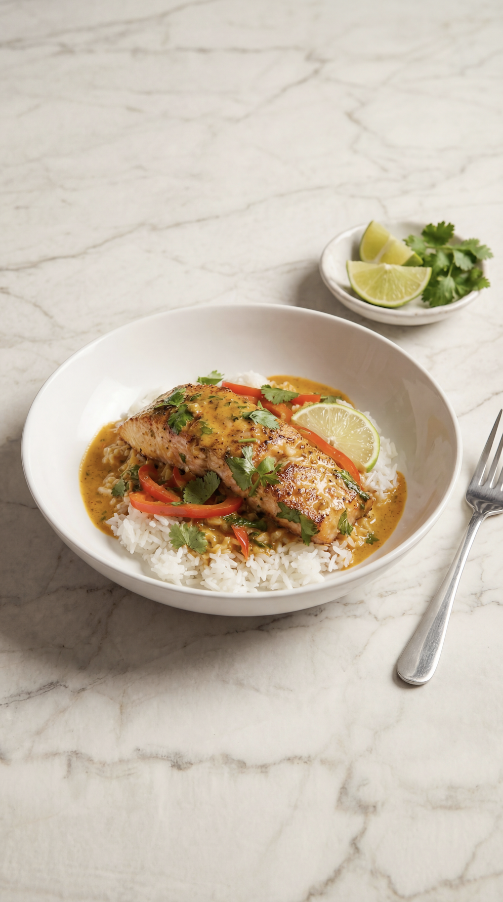 This is one of my favorite recipes to make when I want something comforting, saucy, and full of flavor, without committing to a pile of dishes or an hour of prep. It’s warm and creamy from the coconut milk, gently spicy from the red curry paste, brightened up with fresh lime, and finished with flaky salmon that melts into the sauce.