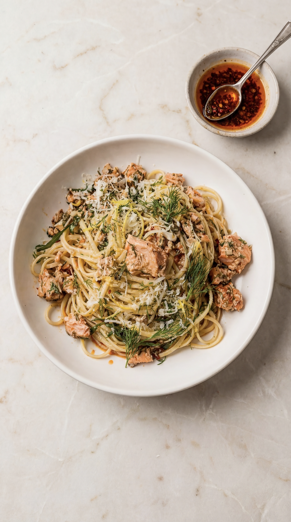 The lemon keeps everything bright, the chili oil adds warmth, the salmon brings richness, and the dill ties it all together with a fresh, herbaceous finish.