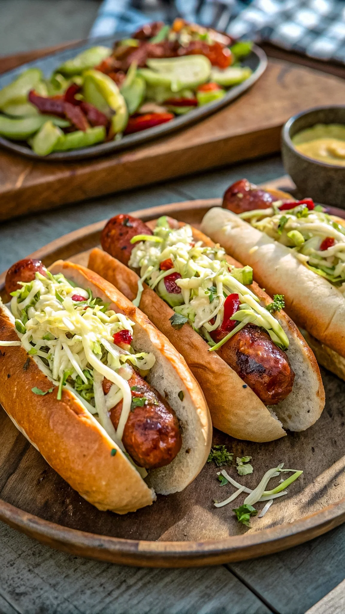 This recipe blends backyard cookout vibes with elevated flavor — the slaw adds crunch and sweetness, the aioli adds depth, and the juicy sausages bring it all home. Serve these at your next barbecue, game day gathering, or weeknight dinner when you want bold flavors and minimal effort.
