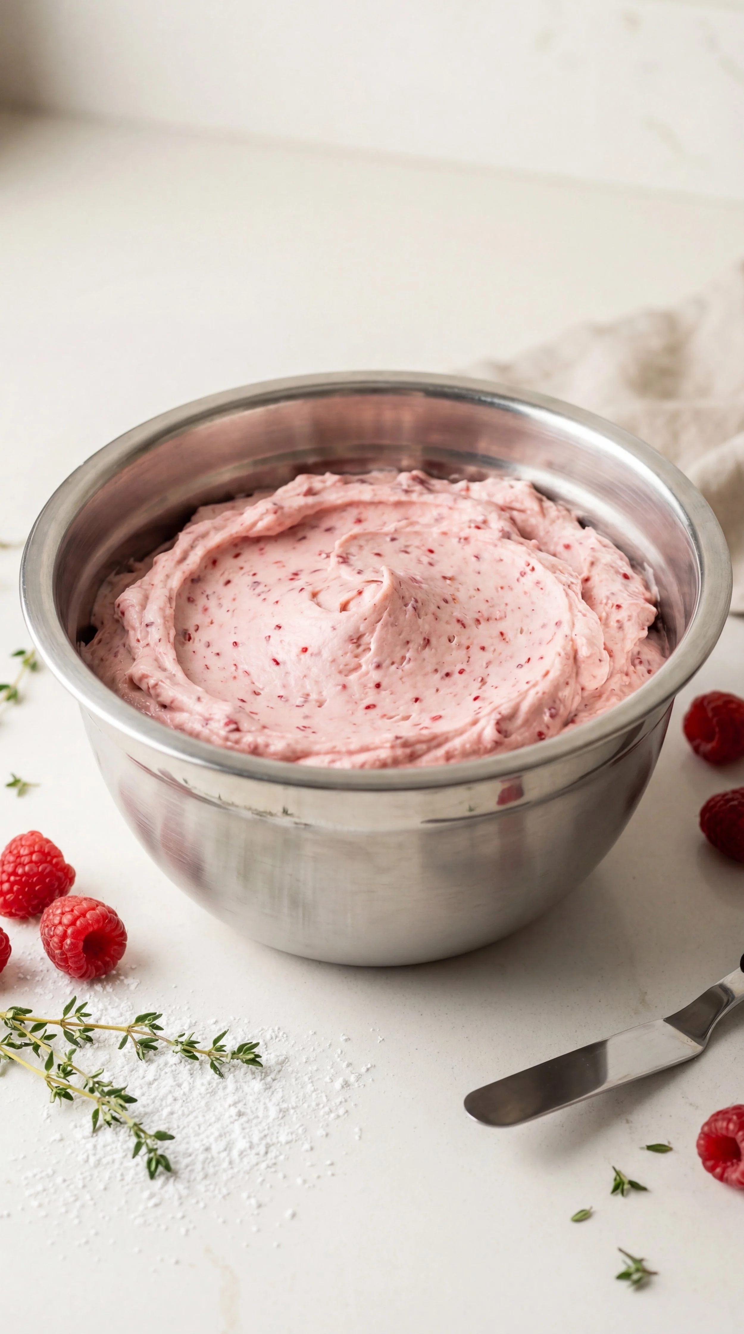 Add the raspberry puree or seedless jam, vanilla extract, and a pinch of salt. Beat until the frosting is light, fluffy, and evenly pink.