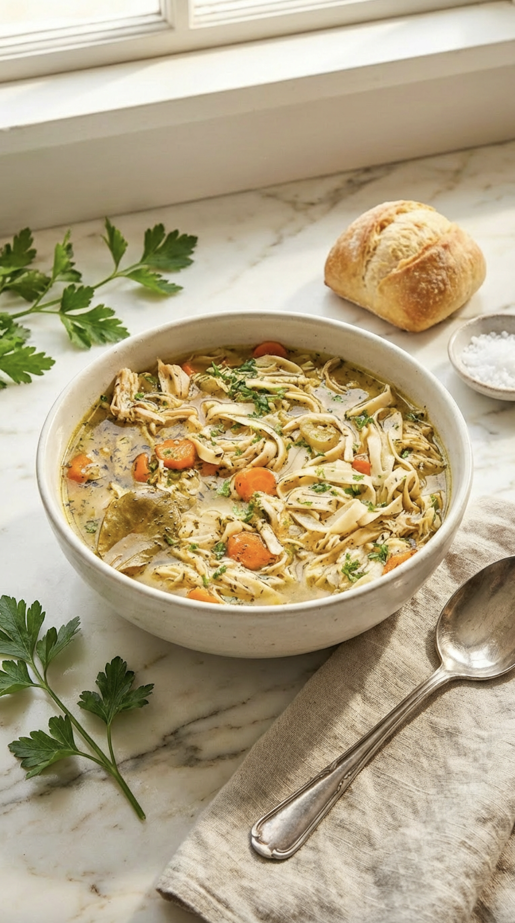 It’s simple, comforting, and deeply familiar in the best way. Tender chicken, soft noodles, carrots, herbs, and a broth that tastes like it had all day - because it kind of did.