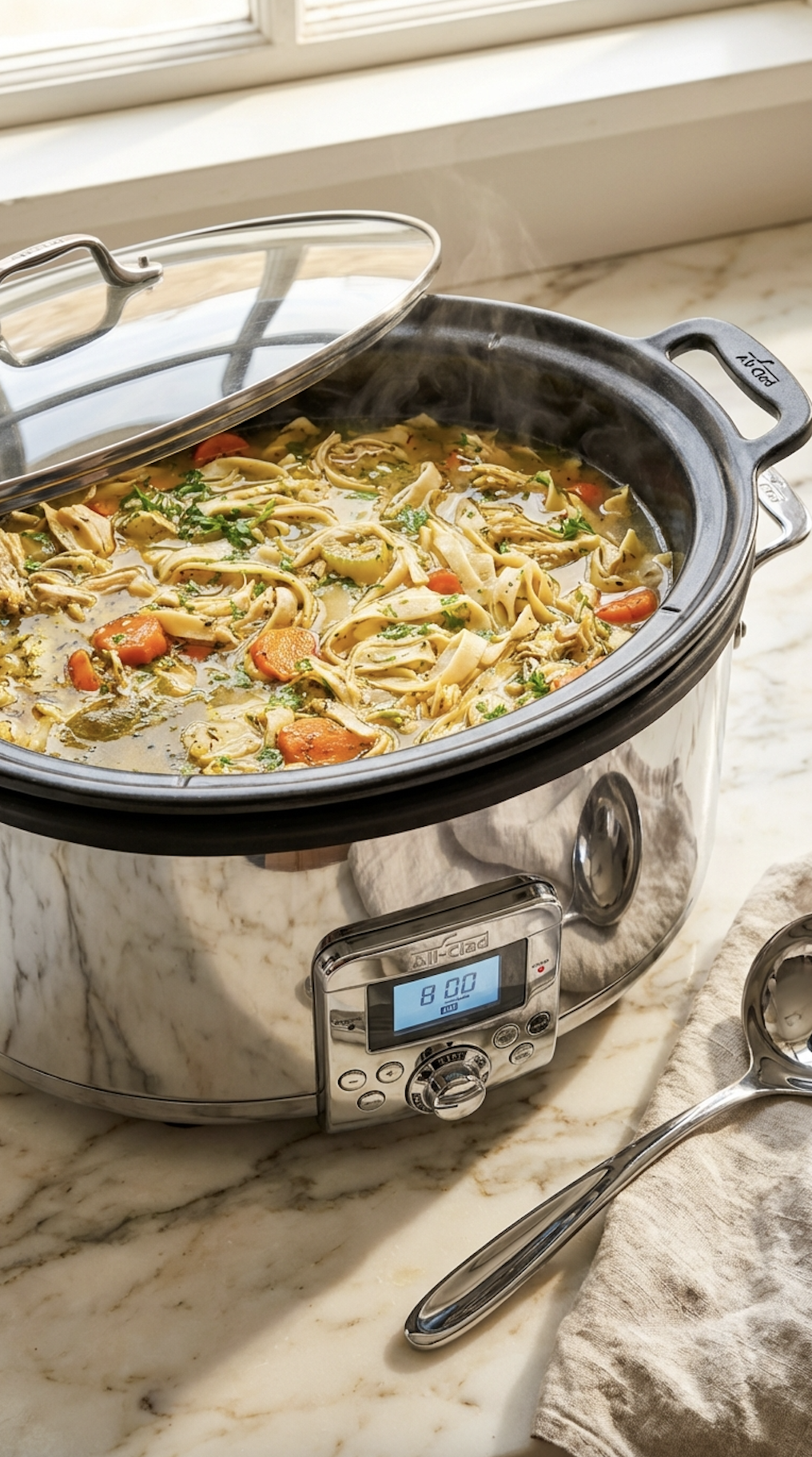 This is my weeknight chicken noodle soup, made in my All-Clad slow cooker, and it’s one of those recipes I come back to again and again when life feels busy and I just want dinner to take care of itself.