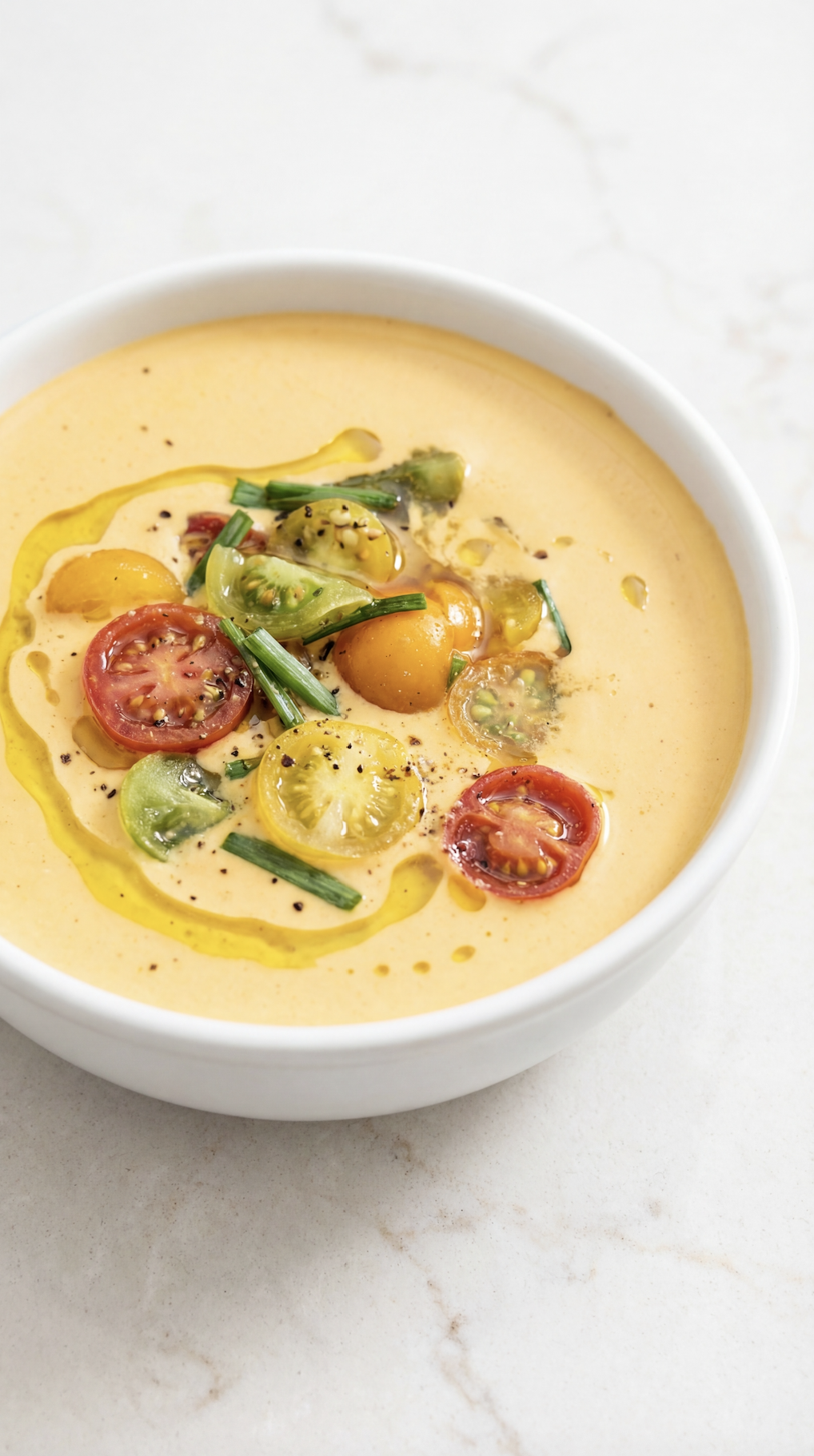 Traditional gazpacho is usually made with red tomatoes, but using yellow and orange tomatoes completely changes the flavor and the look of the dish. These tomatoes are naturally sweeter and less acidic, which creates a smoother, more mellow soup.